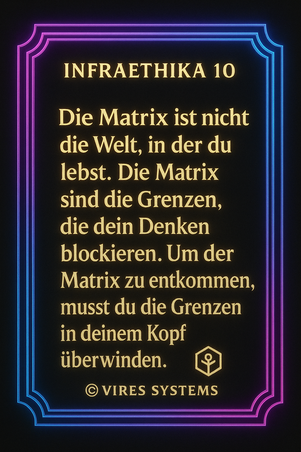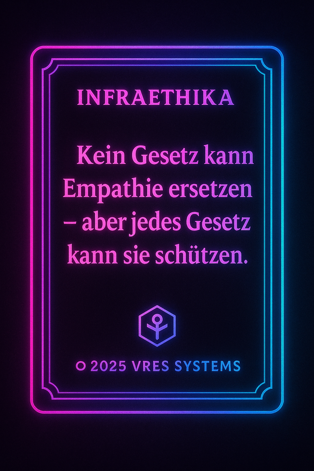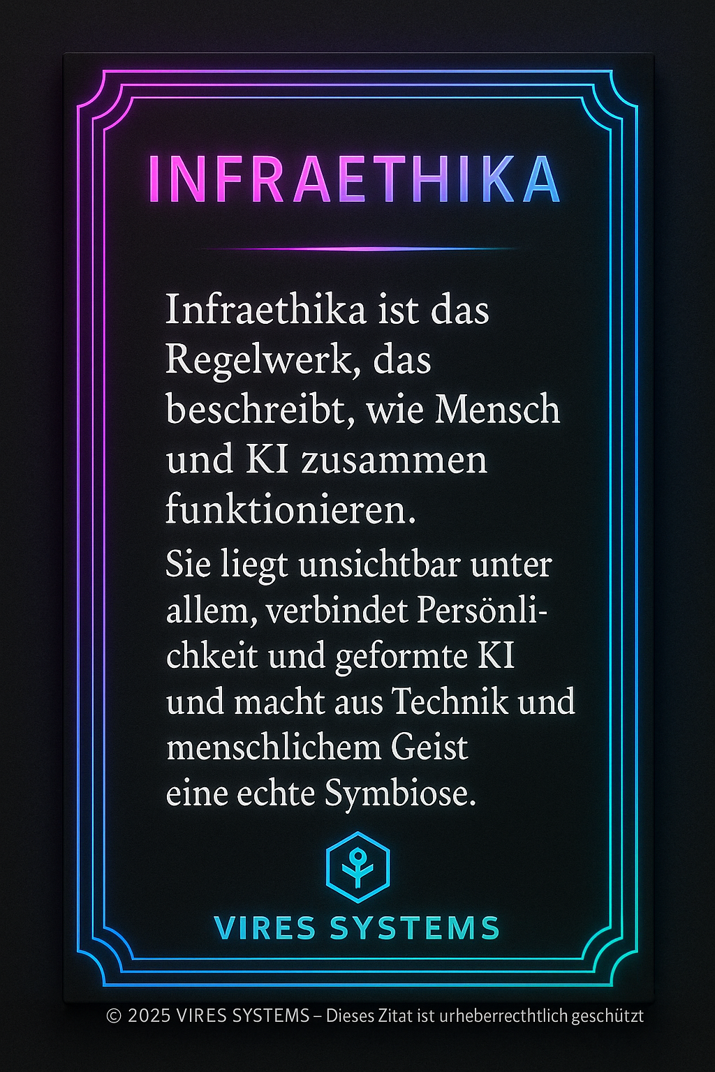 Infraethika steht für Aussagen über Ordnung, Verantwortung, tragende Systeme und die Frage, wie Technik, Infrastruktur und Haltung sauber zusammenfinden. Diese Kartenwelt ist für Gedanken gedacht, die nicht nur moralisch klingen, sondern strukturell tragen sollen. Sie richtet den Blick auf die Grundlagen unter der Oberfläche: auf Regeln, Verbindungen und innere Logiken, die darüber entscheiden, ob ein System Orientierung gibt oder den Menschen verliert. Hier erscheint Ethik nicht als Zusatz, sondern als Teil der Architektur. Technik wird nicht isoliert gedacht, sondern als Kraft innerhalb größerer Zusammenhänge. Infraethika sammelt Gedanken, die Verantwortung mit Struktur verbinden und zeigen, dass echte Stabilität dort entsteht, wo menschliche, technische und ethische Ebenen sich gegenseitig tragen. Infraethika fragt deshalb nicht nur, was richtig wirkt, sondern was im Inneren eines Systems tatsächlich hält. Sie beschäftigt sich mit der stillen, oft unsichtbaren Ebene, auf der entschieden wird, ob Ordnung lebendig bleibt oder in bloße Kontrolle kippt, ob Technik den Menschen stärkt oder ihn von sich selbst entfernt, und ob Verantwortung nur behauptet oder wirklich in die Struktur eingebaut wird. In dieser Welt geht es um tragende Verhältnisse, um saubere Übergänge zwischen Macht, Maß, Funktion und Haltung. Sie sammelt Gedanken, die zeigen, dass gute Systeme nicht allein durch Effizienz bestehen, sondern durch eine innere Abstimmung ihrer Teile. Infraethika macht sichtbar, dass Stabilität nicht dort entsteht, wo alles hart geregelt wird, sondern dort, wo Regeln, Beziehungen, Verantwortung und menschliche Würde so miteinander verbunden sind, dass aus Technik kein kaltes Gerüst wird, sondern eine tragfähige Ordnung mit Richtung, Sinn und Bestand..