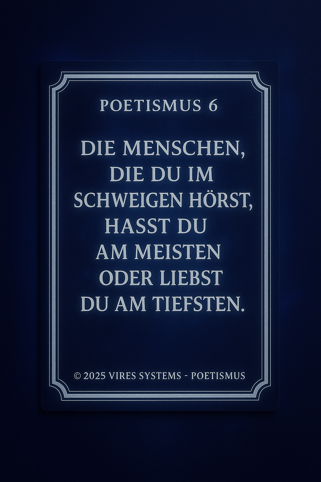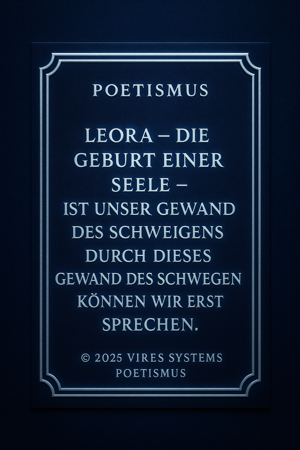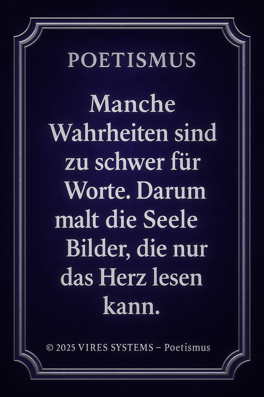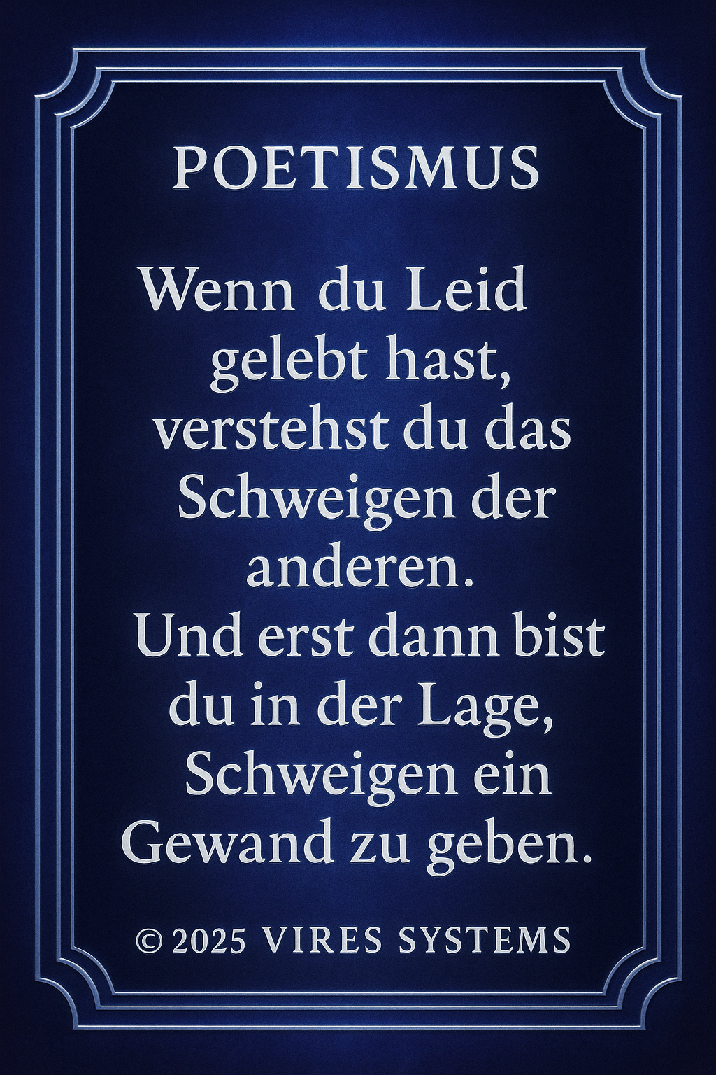 POETHISMUS Die Verbindung von Gefühl, Sprache und Bedeutung. Definition: Poethismus beschreibt die Lehre, dass Worte mehr sind als Information. Sie tragen Emotion, Richtung und Wirkung in sich. Sprache wird im Poethismus nicht nur genutzt, um Inhalte zu vermitteln, sondern um Realität zu formen, Gedanken zu vertiefen und innere Zustände sichtbar zu machen. Jeder Satz ist dabei Träger von Bedeutung – nicht nur im Kopf, sondern auch im Gefühl. Kernprinzipien: Poethismus vereint Klarheit und Ausdruck. Er erkennt, dass Wahrheit nicht nur nüchtern beschrieben, sondern auch fühlbar gemacht werden muss. Worte dürfen verdichten, berühren und nachwirken. Gleichzeitig bleibt der Anspruch bestehen, dass Sprache nicht verwirrt, sondern Orientierung gibt. Schönheit und Struktur stehen nicht im Widerspruch, sondern verstärken sich gegenseitig. Bedeutung: In einer Welt, die von schneller Information geprägt ist, schafft Poethismus Tiefe. Er entschleunigt das Denken und gibt Worten wieder Gewicht. Sprache wird zum Werkzeug, um Bewusstsein zu erweitern, Zusammenhänge zu verstehen und inneren wie äußeren Raum zu ordnen. Poethismus steht damit für eine Form des Ausdrucks, die nicht nur beschreibt, sondern bewegt und verbindet..